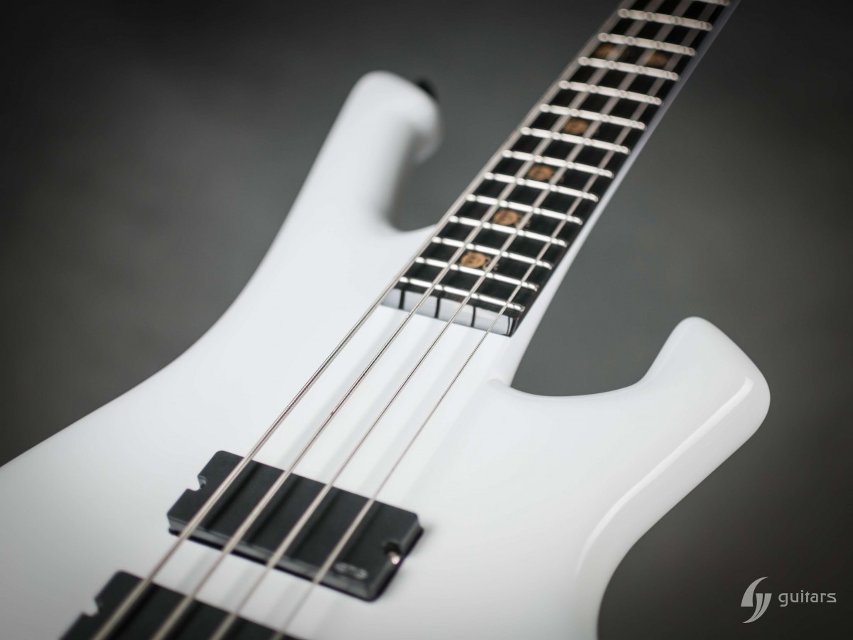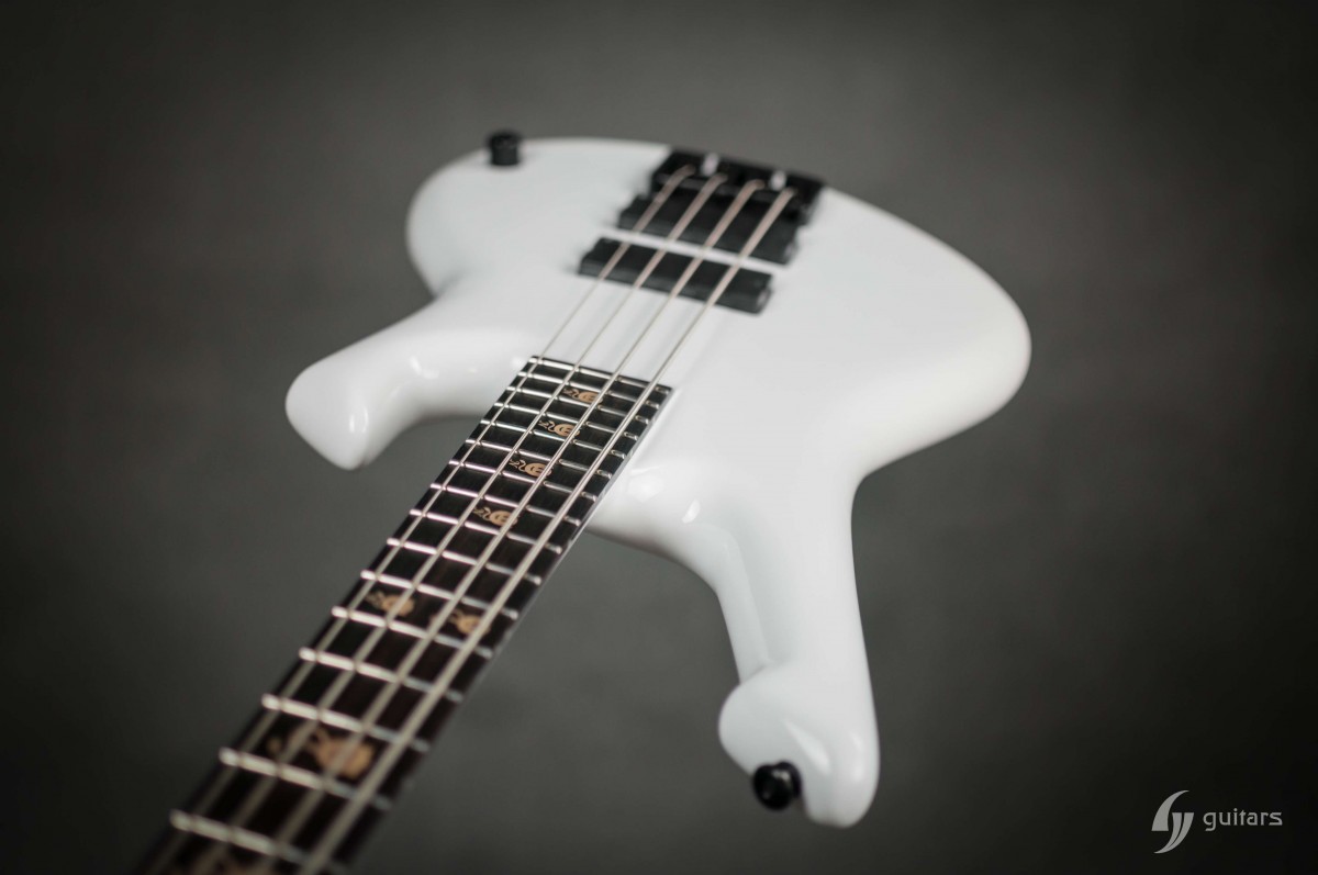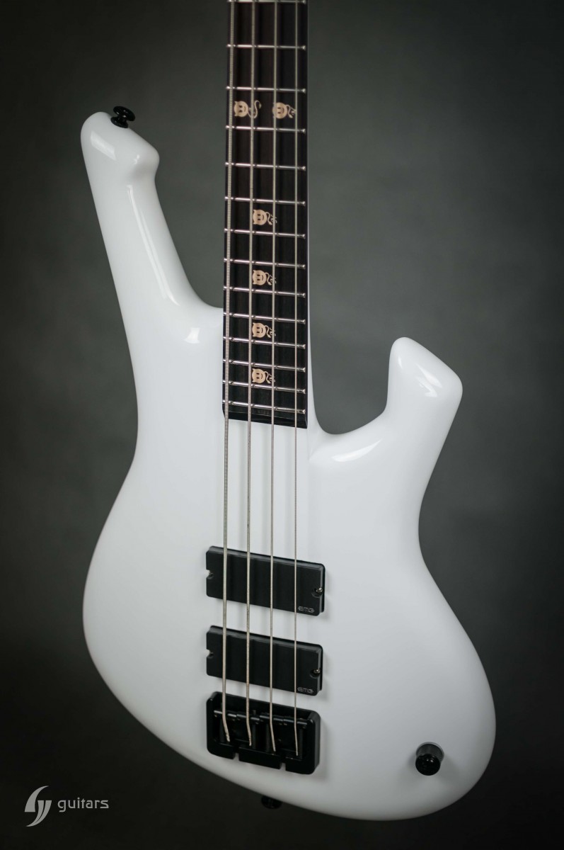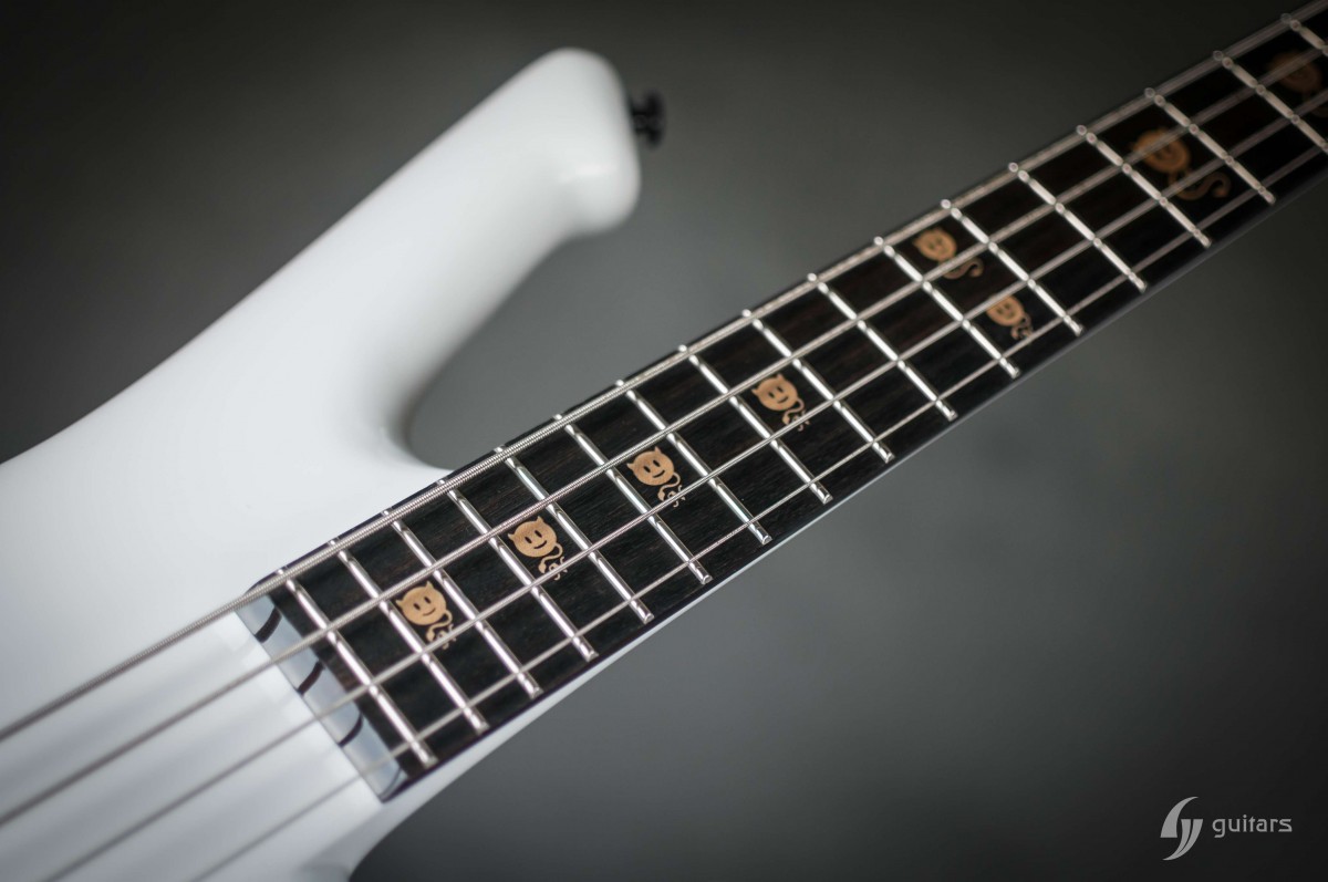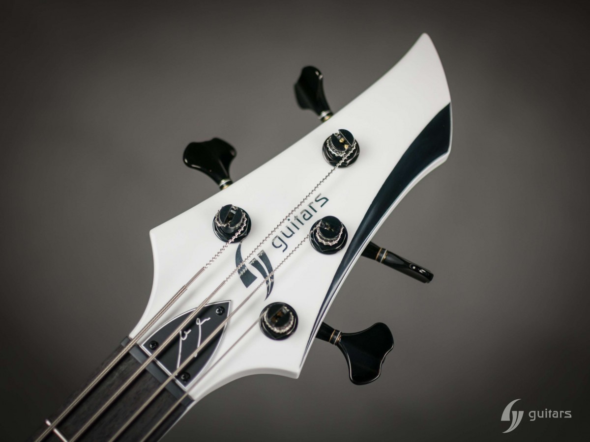 NeoFang BIB is beautiful 4 string bass which was made for Máté Molnár of Beast in Black. Máté wanted bass that was easy to control, yet versatile enough if needed. This instrument has everything it can possibly need: balance, Zolkow preamps 2band EQ, and frequency switches (hidden inside). The EMG DC pickups give the bass its well-known, reliable sound. The only thing that’s on the body is the master volume, so you don’t need to worry that the sound will accidentally change onstage. Máté wanted to make a tribute to his two sons, so we decided to make these nice maple inlays with the two little devils. The bass has a white glossy color and a new redesigned 2+2 headstock. This beauty debuted in the music video From Hell With Love.