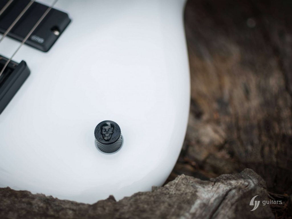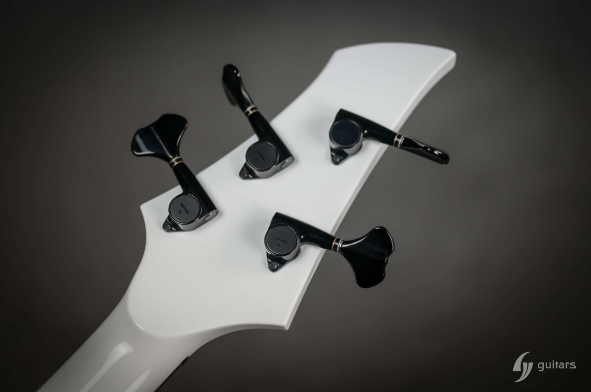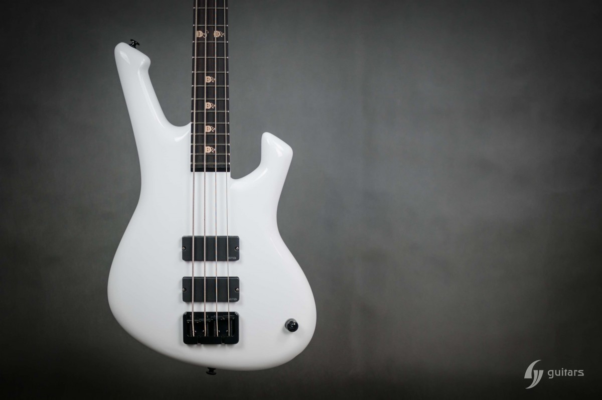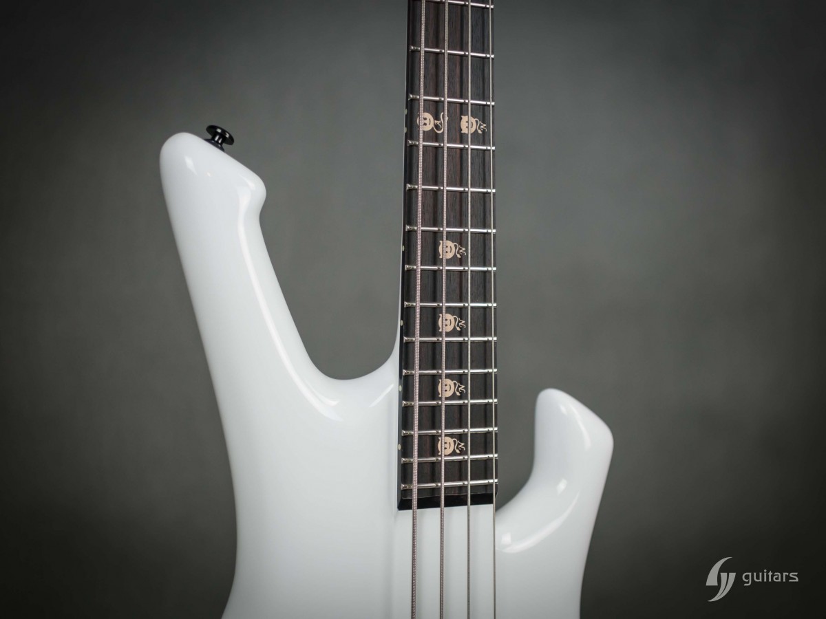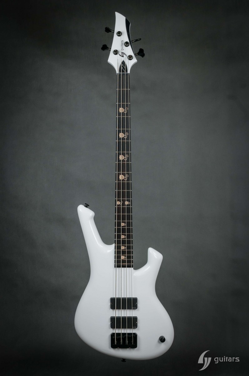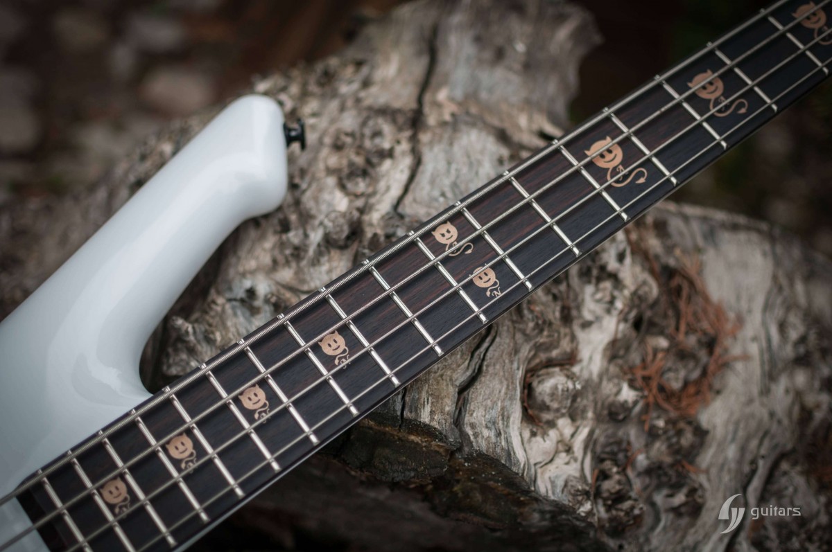 NeoFang BIB is beautiful 4 string bass which was made for Máté Molnár of Beast in Black. Máté wanted bass that was easy to control, yet versatile enough if needed. This instrument has everything it can possibly need: balance, Zolkow preamps 2band EQ, and frequency switches (hidden inside). The EMG DC pickups give the bass its well-known, reliable sound. The only thing that’s on the body is the master volume, so you don’t need to worry that the sound will accidentally change onstage. Máté wanted to make a tribute to his two sons, so we decided to make these nice maple inlays with the two little devils. The bass has a white glossy color and a new redesigned 2+2 headstock. This beauty debuted in the music video From Hell With Love.